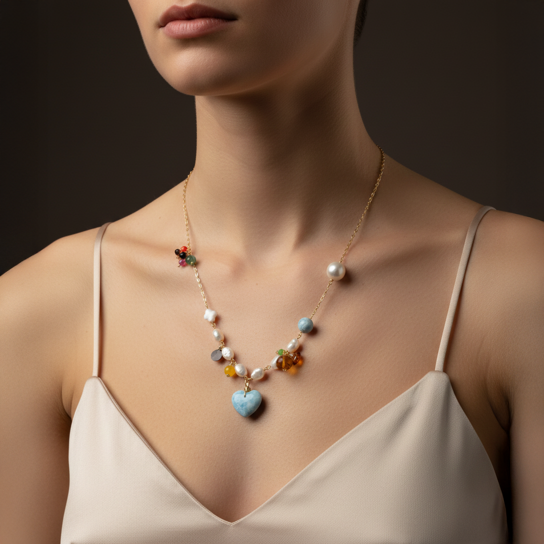 El Larimar evoca la serenidad del mar, las Perlas añaden elegancia eterna, el Ámbar brilla con luz dorada y el Coral aporta fuerza y vitalidad.